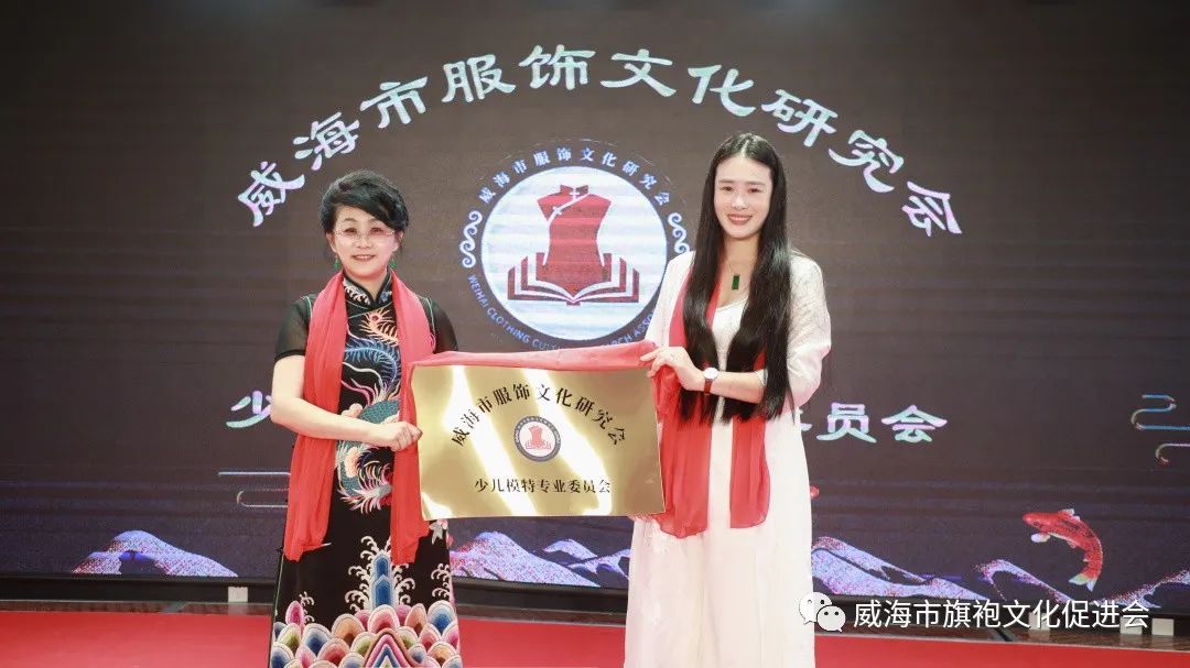 梦浠源会长(左)为威海市服饰文化研究会青少年服饰模特专业委员会刘敏会长(右)授牌