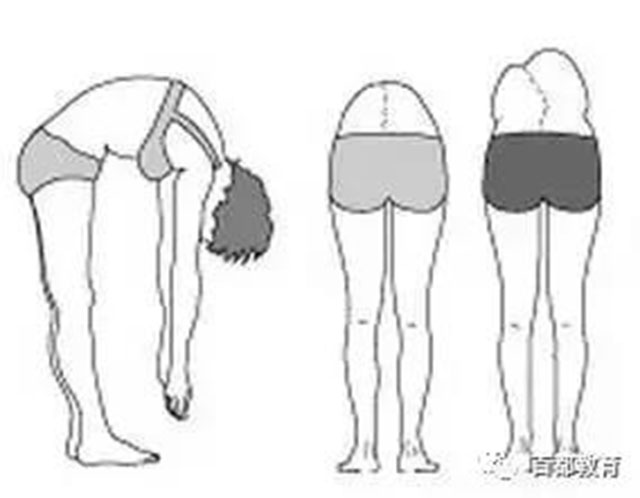 6.让孩子从站立的姿势往前弯,家长站在孩子后面,眼睛平视他的背,观察是否背部有一高一低。(如上图)