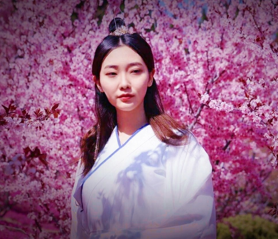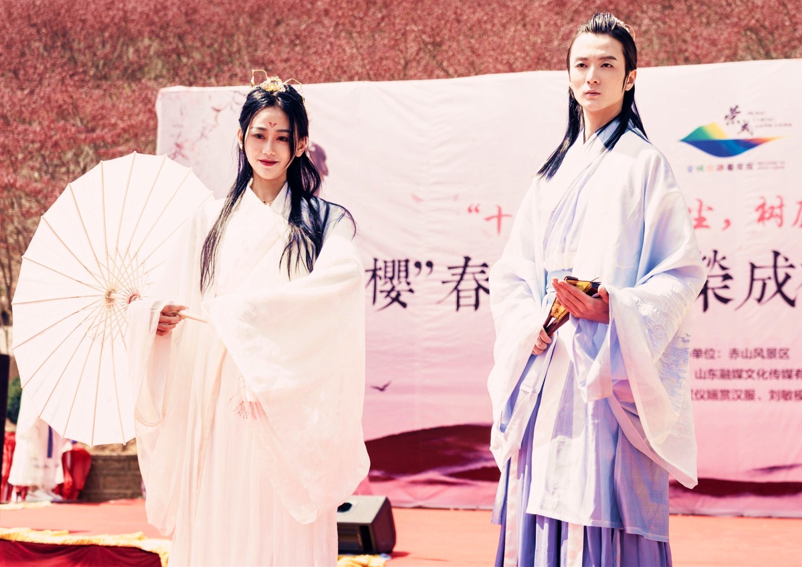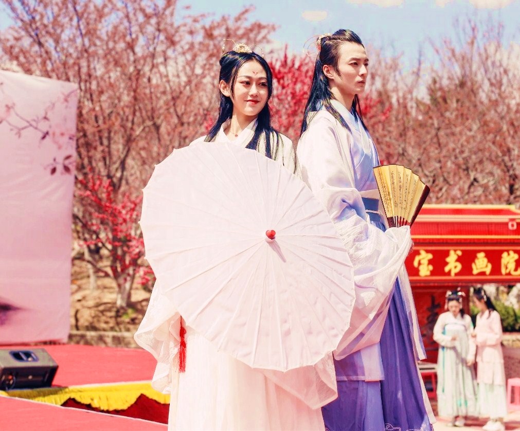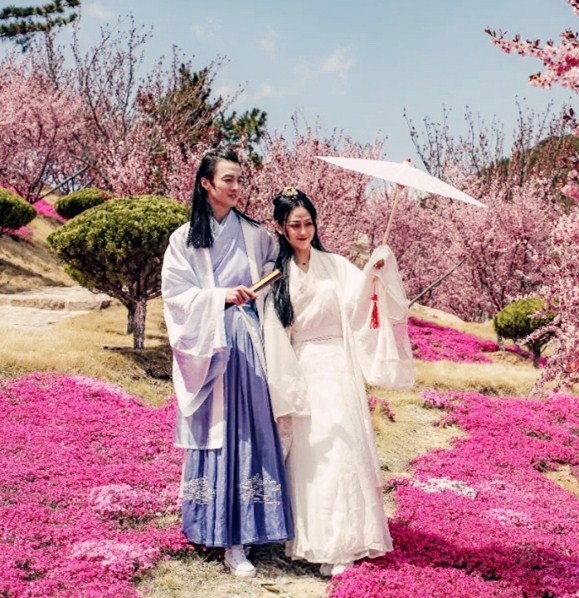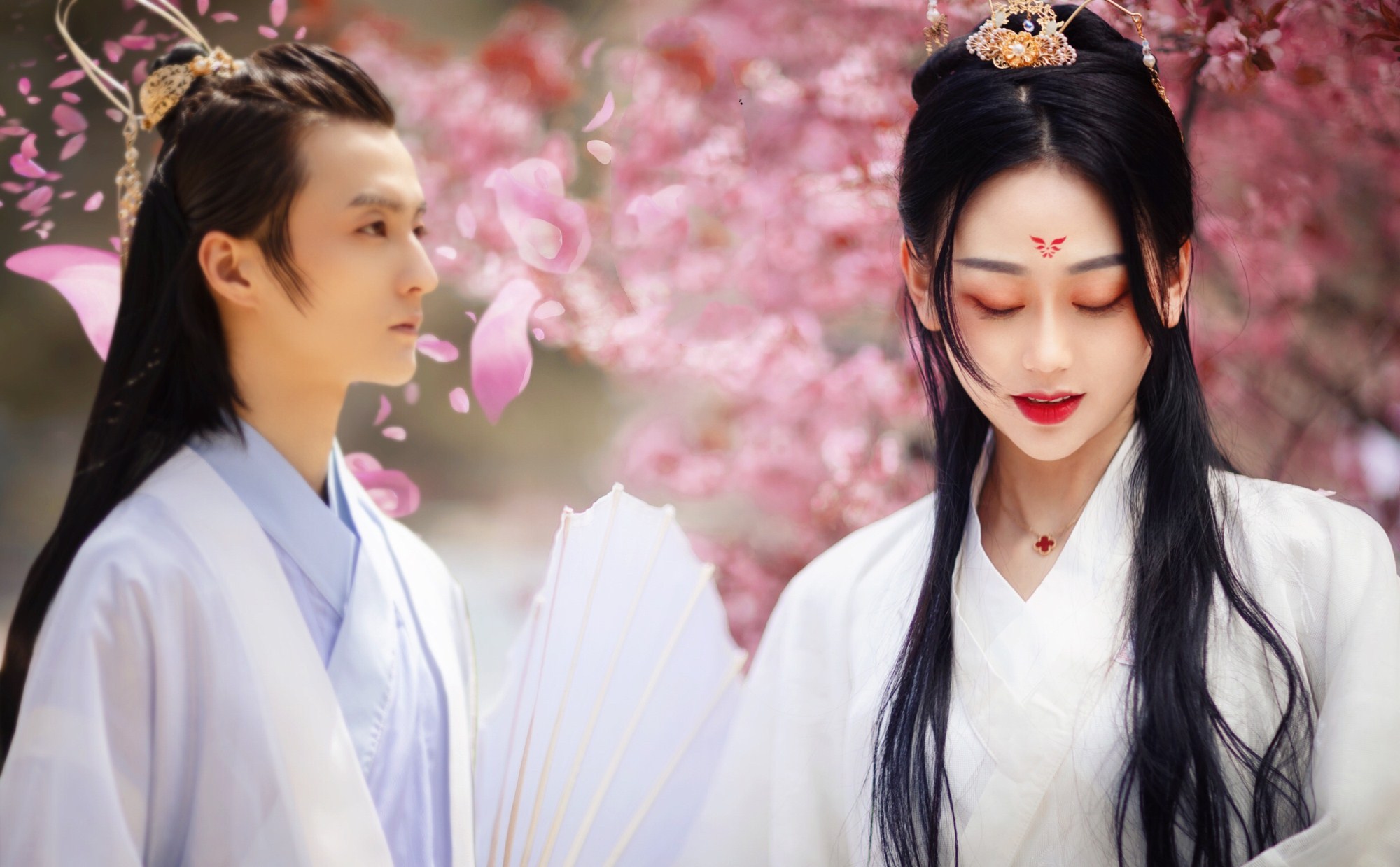俊男靓女的组合加上汉服与樱花的搭配,恍惚间,令人似有穿越千年的错觉。