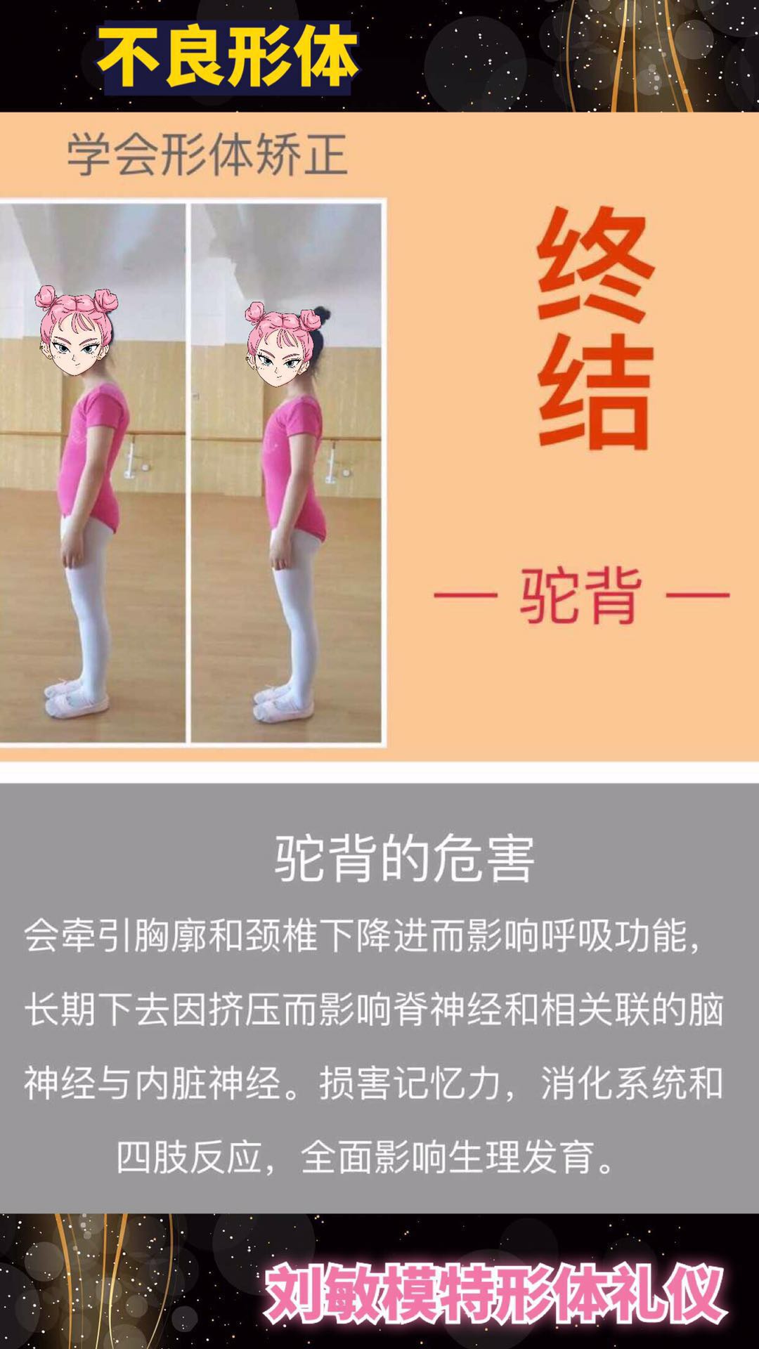 �在很多孩子身上都能找到高低肩、驼背、探颈、内外字等形体问题,不良形体严重者会影响孩子的正常发育及骨骼生长