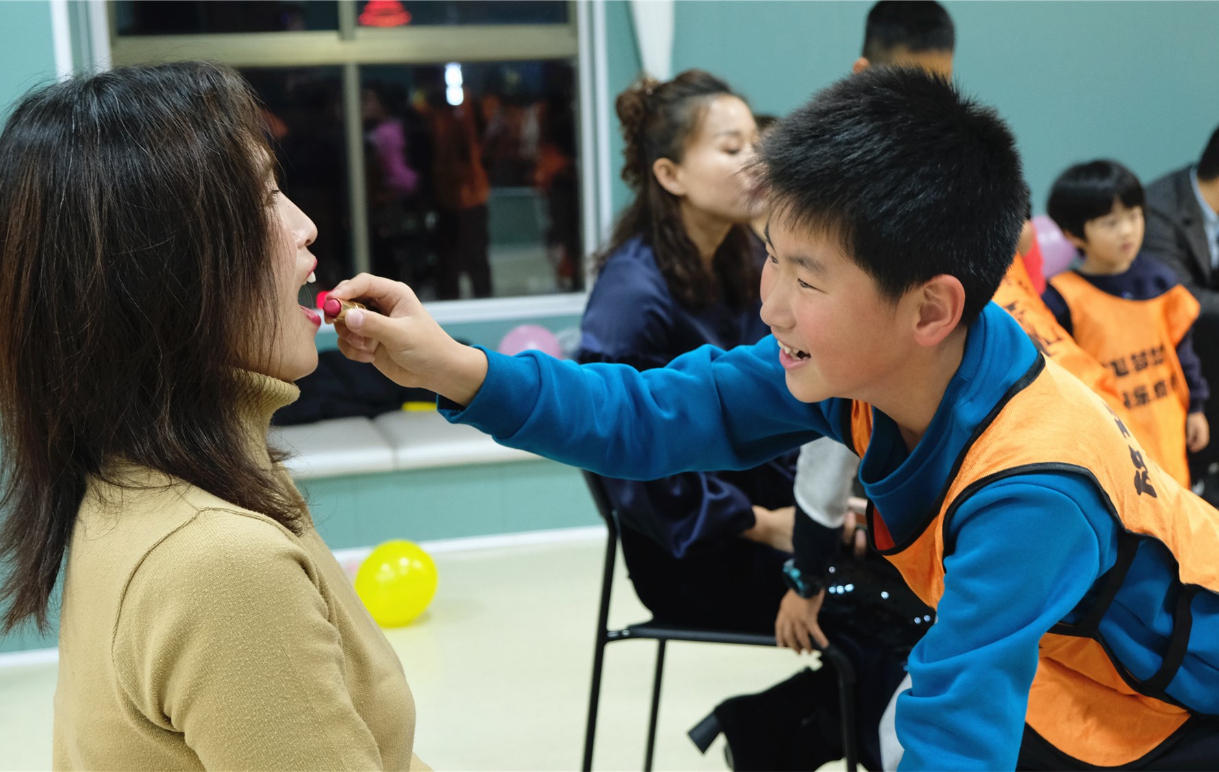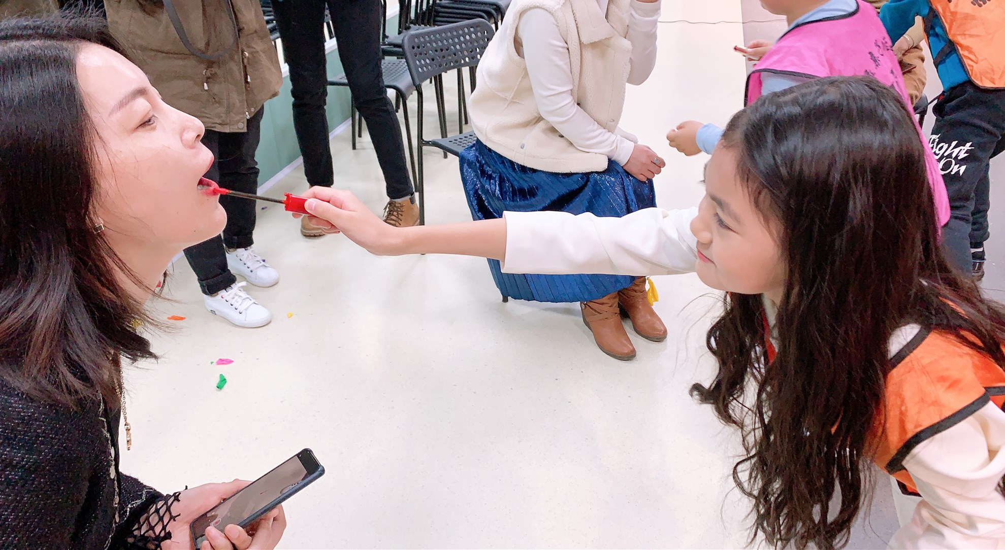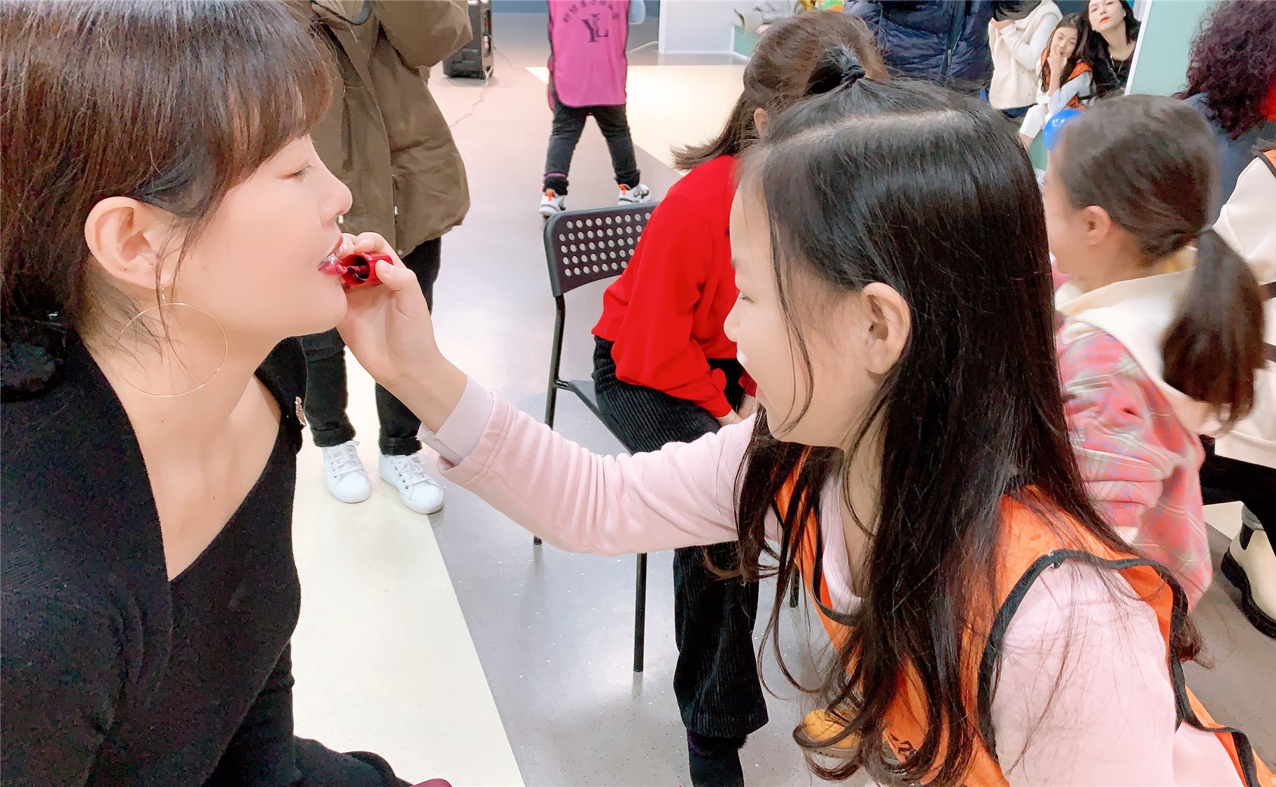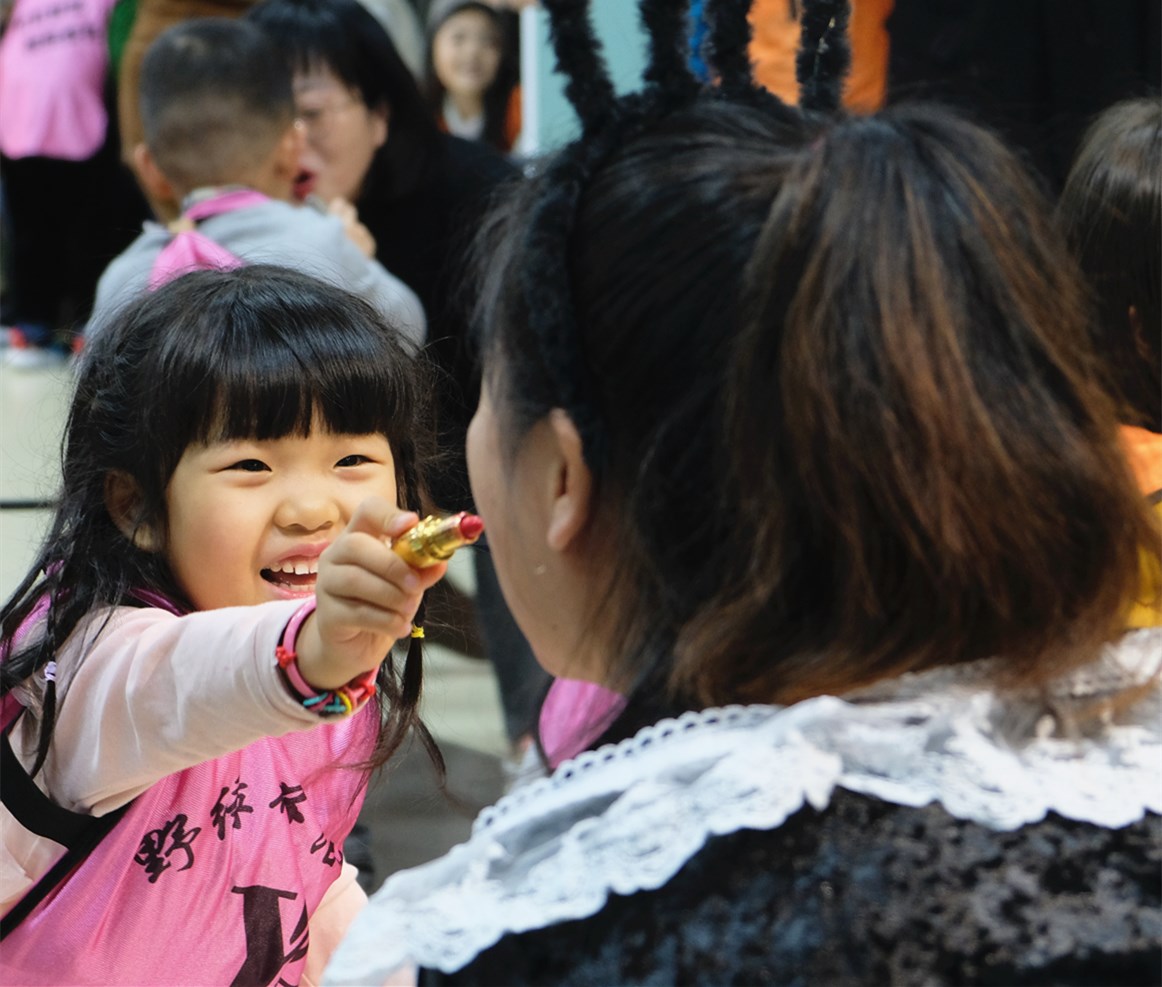 孩子们纷纷拿起口红,给妈妈画上最美的妆容